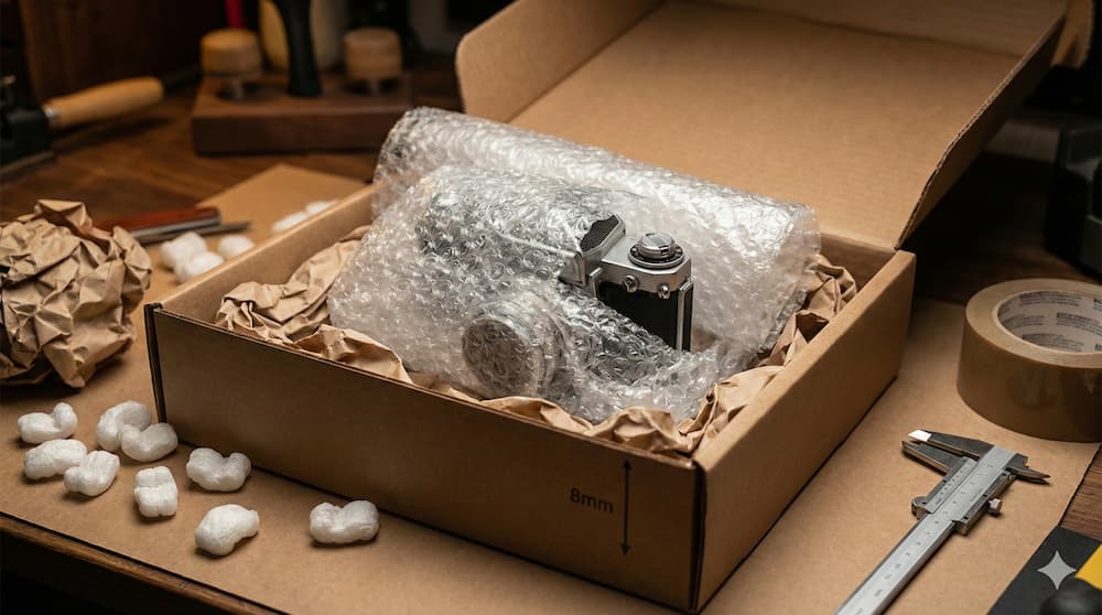 具体的には、厚み8mmの頑丈なダンボールを使用し、通常の3~5mmダンボールよりも耐久性を高めています。内部ではプチプチ(エアキャップ)でカメラ本体を包み、衝撃吸収効果を最大限に引き出します。さらに、梱包箱の内側の隙間には新聞紙や発泡スチロールの緩衝材を詰めることで、荷物の揺れを抑制し、配送中のダメージを防止します。
