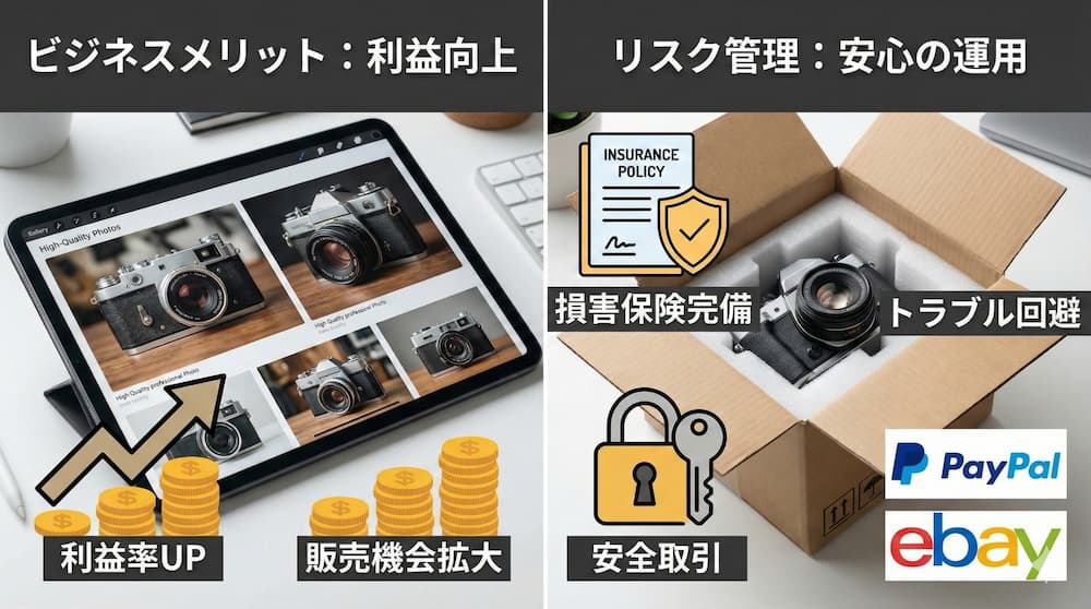 さらに、オクルトは損害保険の適用により、万が一の商品の紛失や破損時もリスクを最小限に抑えます。これらのサービスを活用することで、eBayでのカメラ転売における利益率の改善と運用効率の向上につながります。
