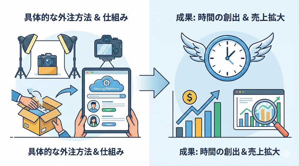 外注化による効果は単に作業時間の削減だけでなく、仕入れや販売戦略に集中できる環境を整え、利益拡大につながる点にあります。これらの基本を押さえたうえで、次項ではより具体的な外注方法について解説します。