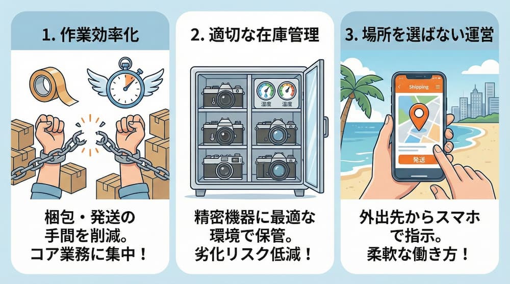 このように、カメラ転売における発送代行サービスは、作業効率化、適切な在庫管理、どこからでも発送指示が出せる柔軟性の3点で大きなメリットをもたらします。後述の代行業者選びのポイントとともに検討することが大切です。