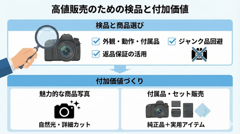 カメラ仕入れにおいて高値で販売を実現させるには、単に商品の状態が良いだけでなく、付加価値をいかに付けられるかが重要なポイントです。特に中古カメラ転売では競合が多いため、顧客の目を引く工夫が利益率を左右します。ここでは、魅力的な商品写真の撮り方と、付属品やセット販売の工夫に焦点を当てて解説します。