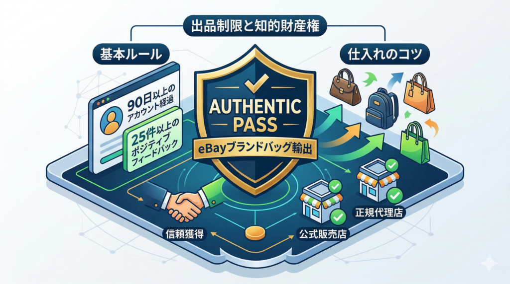 eBayでブランドバッグを輸出する際には、まず基本的なルールと信用構築の条件を理解することが不可欠です。中古ハイブランド品のeBay転売は高利益が期待できる反面、出品には厳しい制約があります。具体的には、90日以上のアカウント経過と25件以上のポジティブフィードバックの獲得が出品の最低条件として設定されています。この条件を満たさない場合、ブランドバッグを出品することは難しく、初心者にはハードルが高いことが現実です。