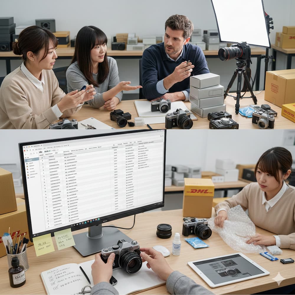 近年、検品・清掃・撮影・発送までを一括で代行するサービスが注目されています。このような丸投げ代行サービスの最大のメリットは、複数の工程をワンストップで任せられる点です。専門スタッフが中古カメラの外観・光学・動作の検品を詳細に行います。加えて、経年劣化の補修やモルト張り替えなどの清掃作業も低価格で対応してもらえるため、輸出モデルの付加価値向上につながります。