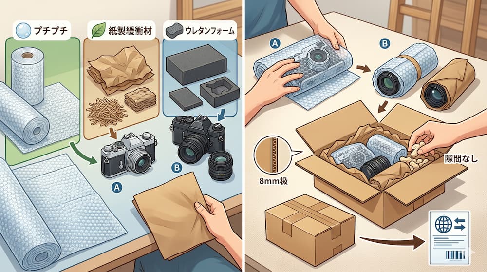 中古カメラの輸出では、デリケートな内部構造や高価なレンズ部分を守るため、適切な緩衝材選びが欠かせません。プチプチ(エアーキャップ)は衝撃吸収性に優れ、カメラ本体を二重に巻くことで輸送中のダメージを効果的に防ぎます。また、新聞紙や紙製緩衝材は隙間埋めに最適であり、軽量かつ環境への負荷を減らせる点でおすすめです。さらに、高価格帯のカメラにはウレタンフォームを使用し、形状にフィットさせることで高い保護効果を発揮します。